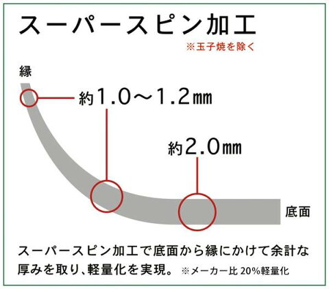 スーパースピン加工で底面から縁にかけて余計な厚みを取り、軽量化を実現しました。