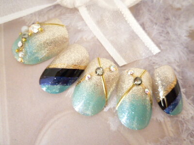 ネイルチップ♪サイズオーダーネイルチップ♪アートネイルチップ♪成人式ネイルチップ・ブライダルネイルチップ・ウェデイング・結婚式ネイル☆♪和柄ネイル・着物・和装・浴衣・振袖/オーバル・ラウンドにも対応ネイルチップ●モロッコブルー純銀入り
