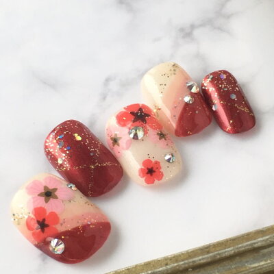 ネイルチップ 成人式 つけ爪 和装 着物 かわいい ブライダル デザイン ショート ロング 短い爪 小さい爪 大きい爪 ベリーショート ちび爪 和柄 和風 振袖 色打掛 浴衣 付け爪●赤レッドピンクフラワー